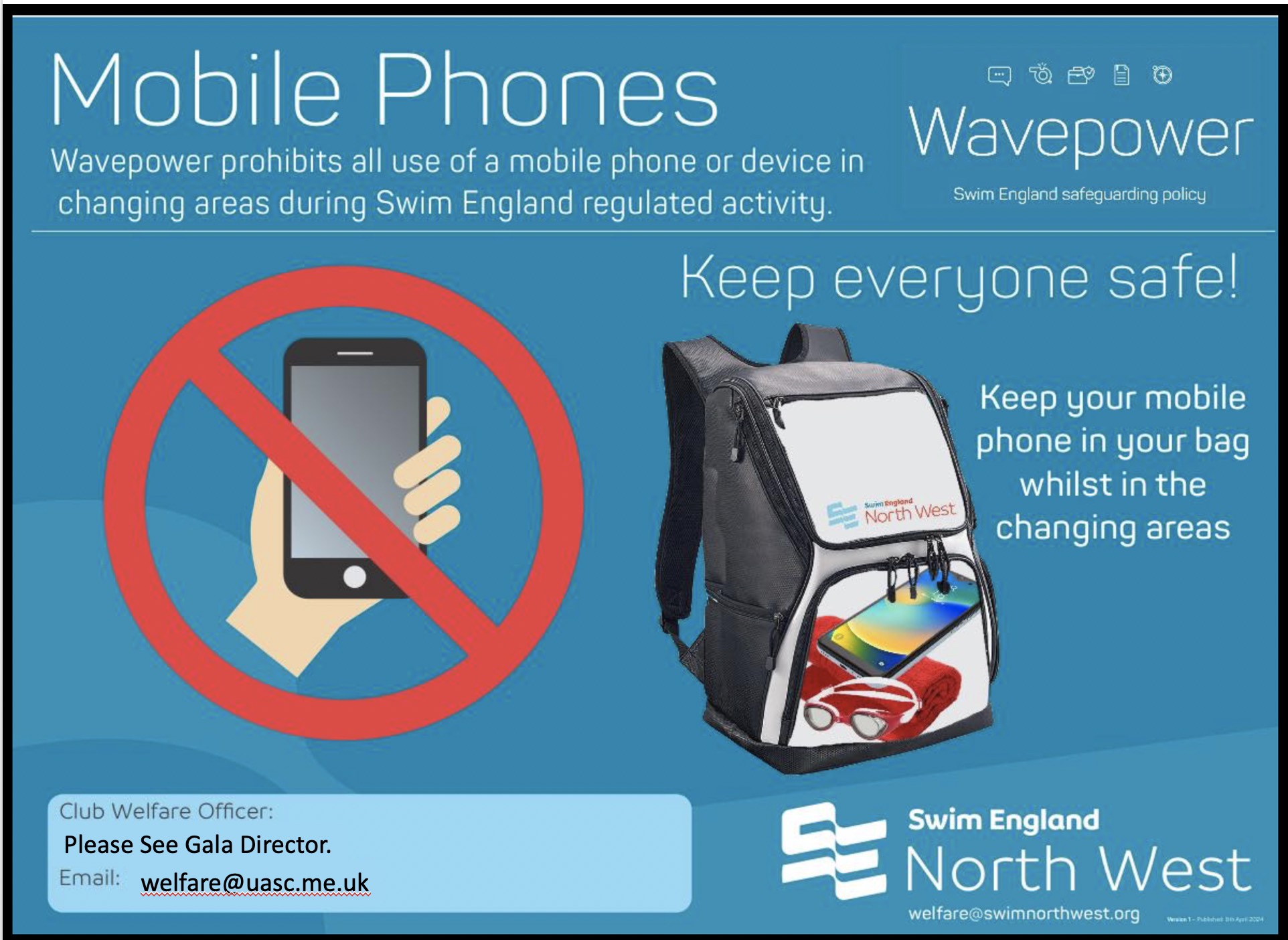 No Large bags on poolside, and mobiles are NOT to be used witin the changing villige or on poolside to take photos or videos.